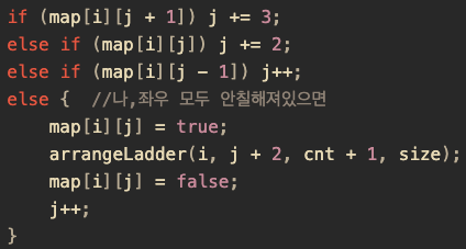 if (오른쪽에 가로선이 이미 있는 경우) -> 오른쪽 칸과 오른쪽의 오른쪽칸은 못그리므로 3번째 오른쪽 칸으로 이동