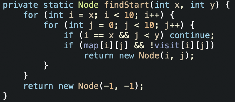 그런데 이렇게 할 필요 없이 매번 findStart를 (0, 0) 부터 돌게 하면