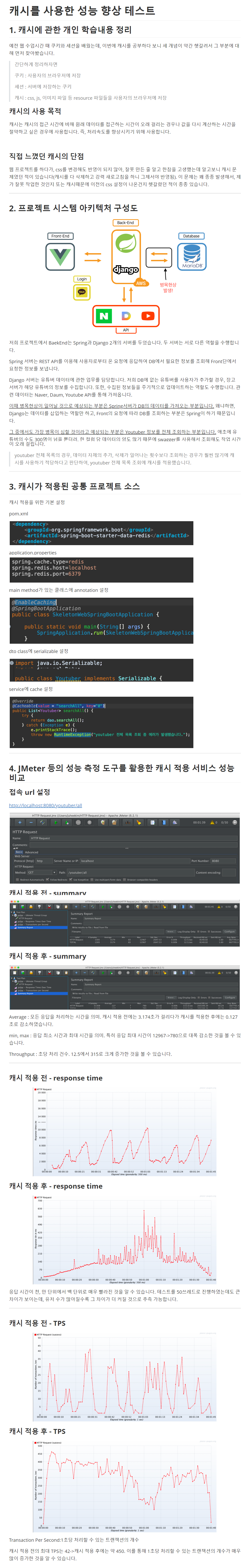 직접 실습을 진행해 보니, 캐시를 사용했을 때 훨씬 속도가 빨라지는 점을 알 수 있었습니다.