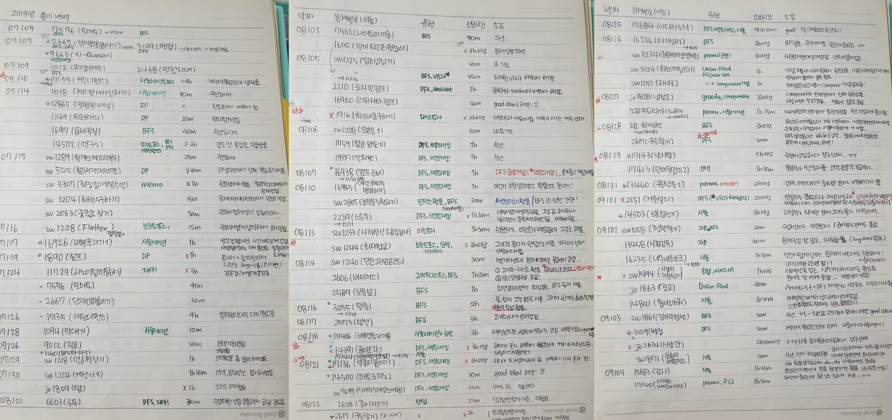 | 20/09/09 | 백준 | 17136.색종이 붙이기 | BackTracking | 49m | 예전에 너무 힘들게 풀었던 기억이 있어서 쫄았는데 이번에 쉽게 풀려서 당황..ㅎㅎ | 3 | O |