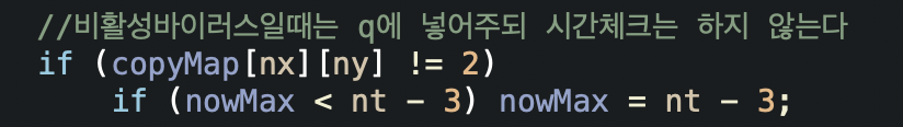(이때 나는 활성 바이러스는 3부터 값을 매겼다. 그리고 시간을 계산할때는 -3을 해줘서 계산했다.)