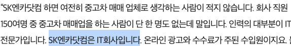 즉, "엔카닷컴은 IT회사이고 제공하는 서비스가 중고차 매매인 것"이라는 표현이 더 적합하다고 생각합니다. 그래서 개발자로서의 첫 시작을 하고 배우고 성장하기에 굉장히 좋은 회사라고 생각합니다.
